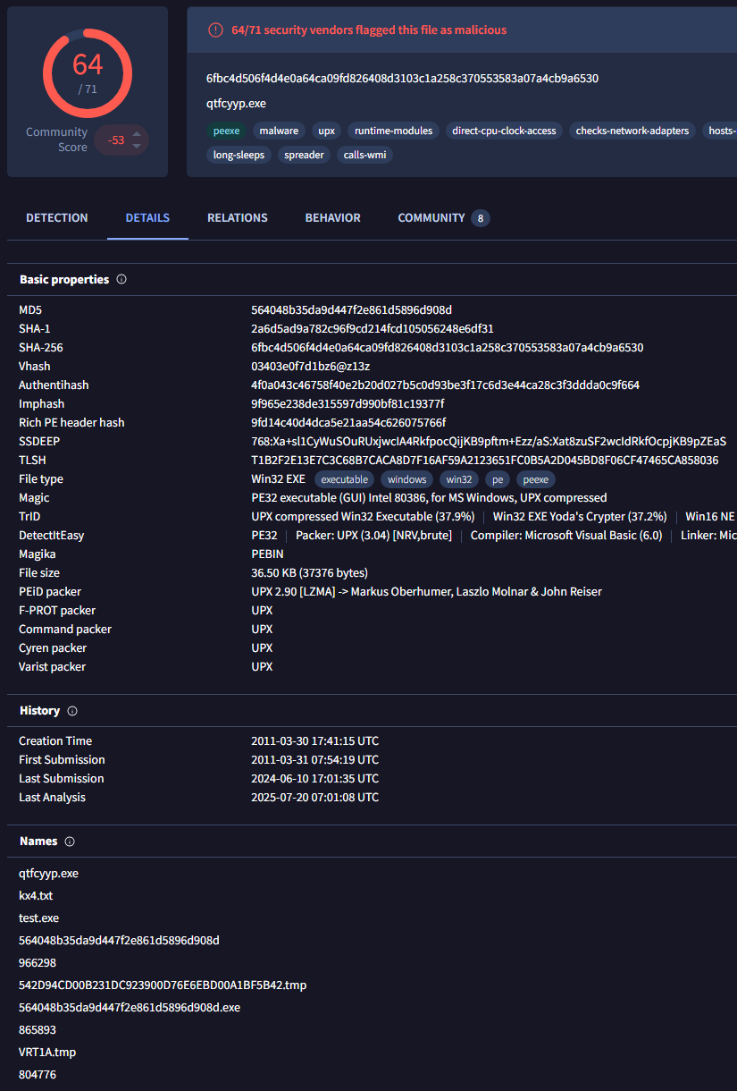 Now we've identifed how many files were sent from our IP. Next we need to identify if they are malicious. We can do this by copying the md5 hash and navigating to any antivirus analysis website (I personally use VirusTotal) and see if it matches any known malicious files.