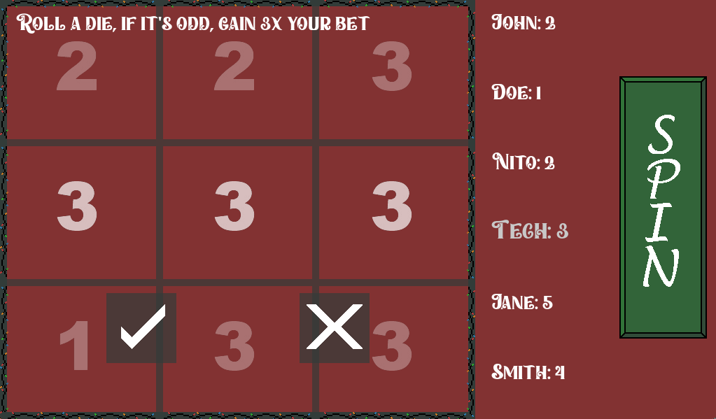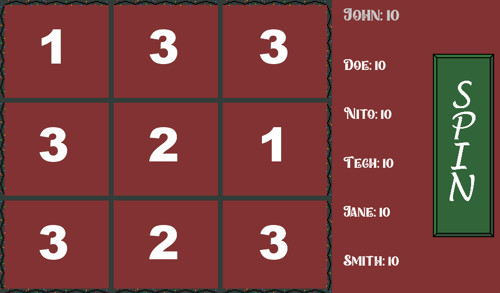 I'm sure that description may leave a lot to be desired so I will provide some picture of how the game looks below. When the game was actually ran, I had symbols of a Christmas Tree, Reeth, and Ornament. However that art isn't mine and was largely influenced from art I found online so I won't include it in my images below.